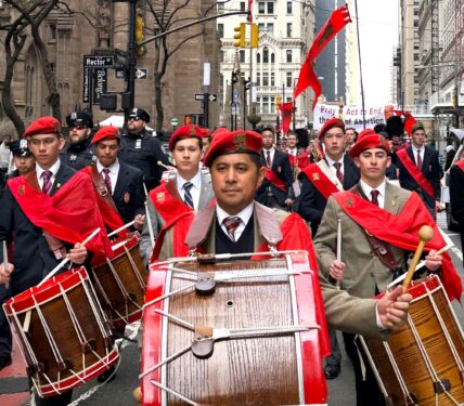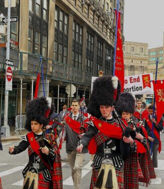 LOWER MANHATTAN — Lunchtime pedestrians and tourists took double-takes on March 25 as the normal bustle of the Financial District gave way to drums, bagpipes, and megaphones carrying slogans of the pro-life movement.