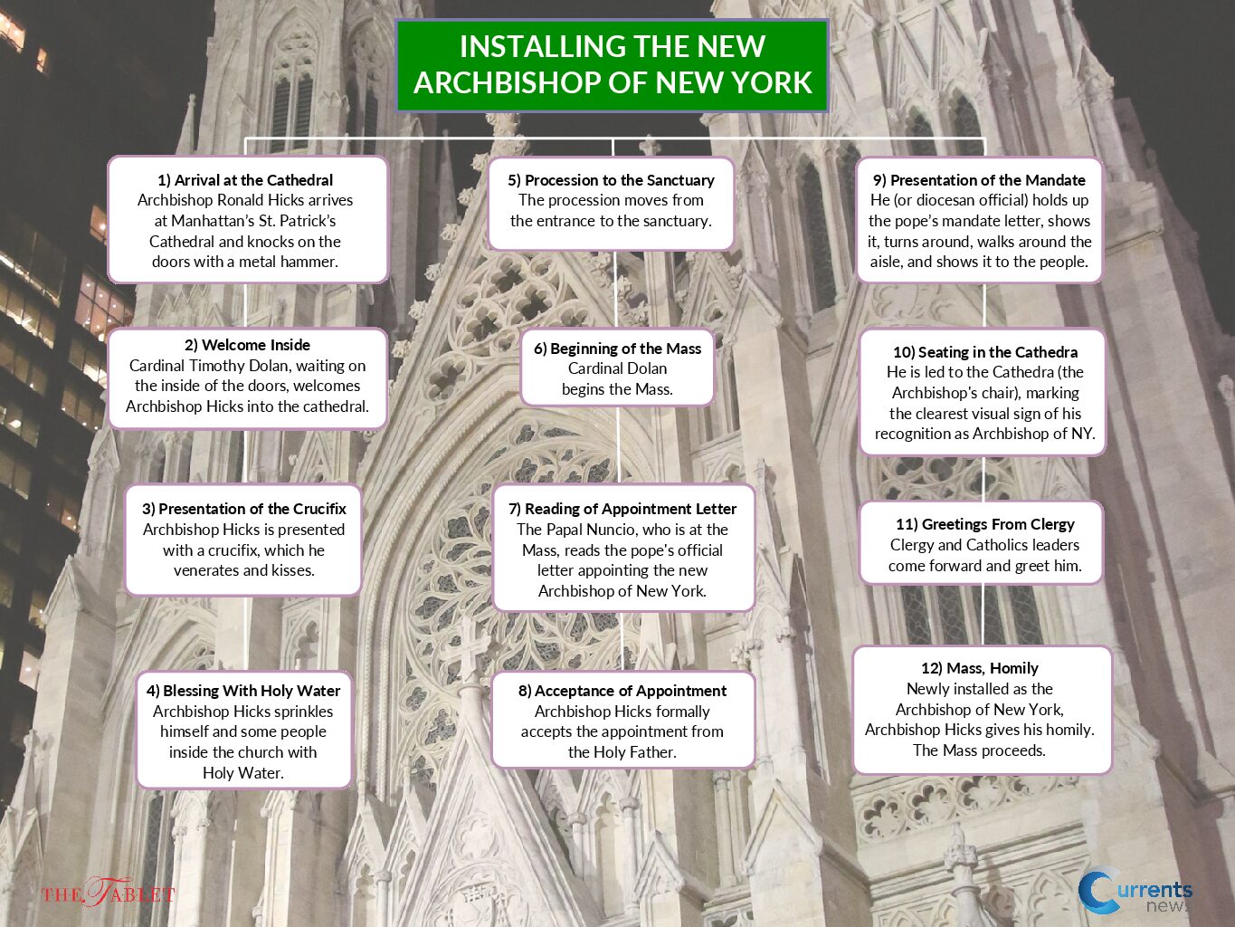 Then, as the official archbishop of New York, people who reflect the entire archdiocese — clergy, religious, laity — will come forward to welcome Archbishop Hicks to the archdiocese. Following that, Mass will continue as usual.
