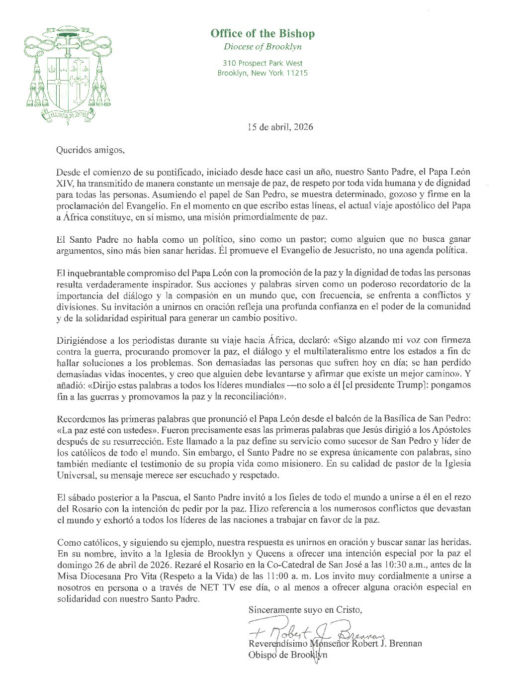 As Catholics, and following his example, our response is to unite in prayer and seek to heal wounds. In his name, I invite the Church in Brooklyn and Queens to offer a special intention for peace on Sunday, April 26, 2026. I will pray the Rosary at the Co-Cathedral of St. Joseph at 10:30 a.m., before the 11:00 a.m. Diocesan Pro Vita (Respect Life) Mass. I welcome you most heartily to join us in person or through NET TV, on that day, or at least to offer some special prayer in solidarity with our Holy Father.
