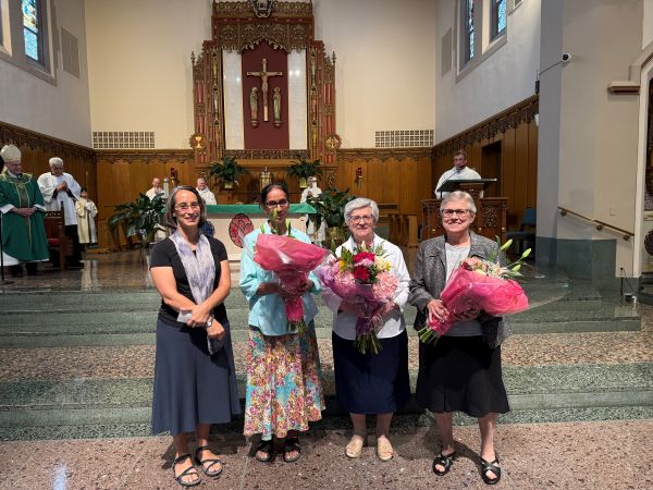 The St. Kevin Church community presented the Apostolic Oblates with flowers to thank them for their service. From left to right: Joan Patten, Mariakutty Joseph, Agnes Rus, and Renee Jarecki.