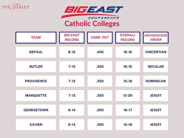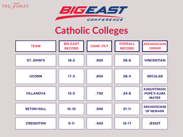 Of the conference’s 11 men’s basketball schools, nine are Catholic. St. John’s University, which sits atop the conference after winning its second consecutive Big East regular-season title, is joined by Creighton University, DePaul University, Georgetown University, Marquette University, Providence College, Villanova University, Seton Hall University, and Xavier University.