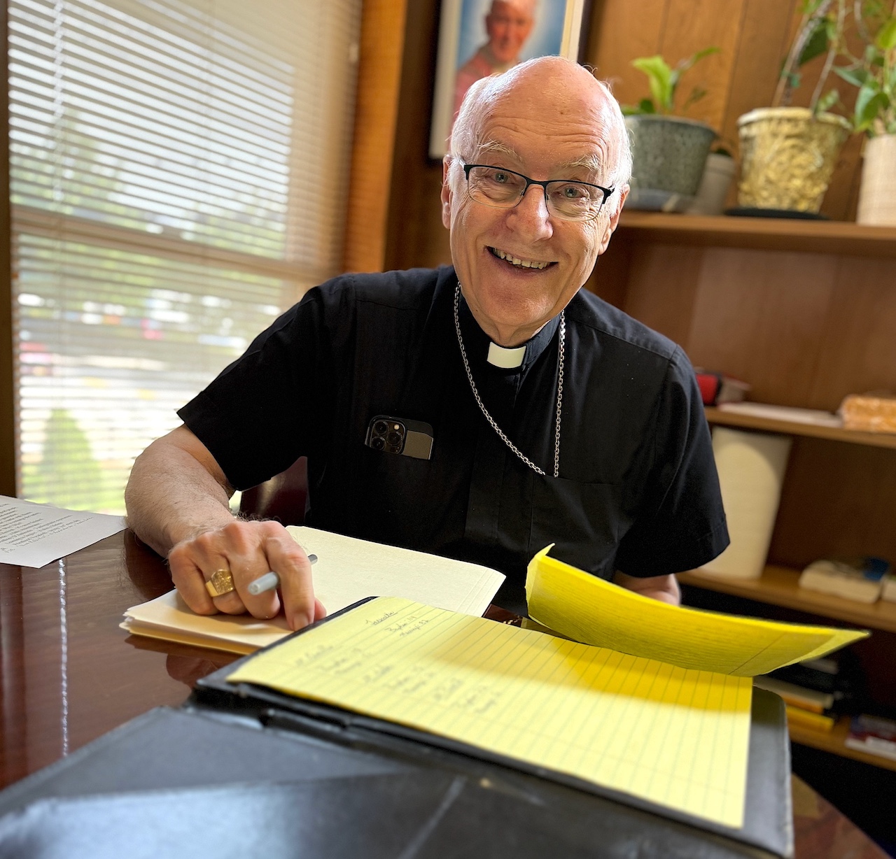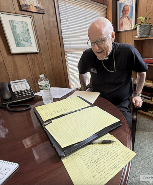 Auxiliary Bishop Emeritus Raymond Chappetto, who retired in 2022, writes “Bishop Ray’s Blog” on a yellow legal pad. Next, the staff at St. Luke’s Parish in Whitestone types the blog into a digital format, which is emailed to Adriana Rodriguez, director of communications for the diocese. Rodriguez posts the content on the internet. (Photo: Bill Miller)