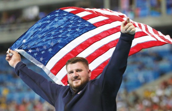 U.S. track and field athlete Joe Kovacs holds the American flag Aug. 19 at the Olympics in Rio de Janeiro. He won silver in the men’s shot put final. The Pennsylvania native is a Knight of Columbus and a 2007 graduate of Bethlehem Catholic H.S. in the Diocese of Allentown, Pa.