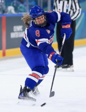 Winn, a 5-foot-5-inch defenseman wearing uniform No. 8, logged substantial ice time in every Olympic game. Offensively, she netted her first Olympic goal — in a 5-0 win over Switzerland Feb. 9 — and three assists during the Games.