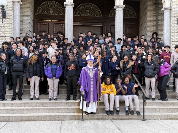 High schoolers who arrived at the Co-Cathedral of St. Joseph on buses were greeted by Bishop Robert Brennan, who also posed for photos on the co-cathedral steps with students. (Photo: Paula Katinas)