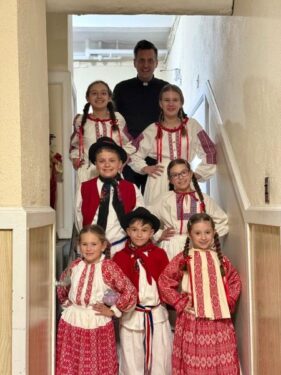 Father Ilijić with young members of the Croatian cultural dance group.