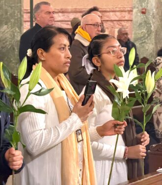 The Mass, celebrated by Msgr. Joseph Grimaldi, vicar general for the diocese, was held on the feast of St. Joseph. Many members of the congregation wore white and carried lilies, which are associated with the saint.