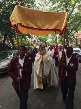 Father Dwayne Davis, the newly appointed administrator of St. Thomas Aquinas parish, Flatlands, bore the monstrance as the Corpus Christi procession made its way through the streets of the neighborhood.