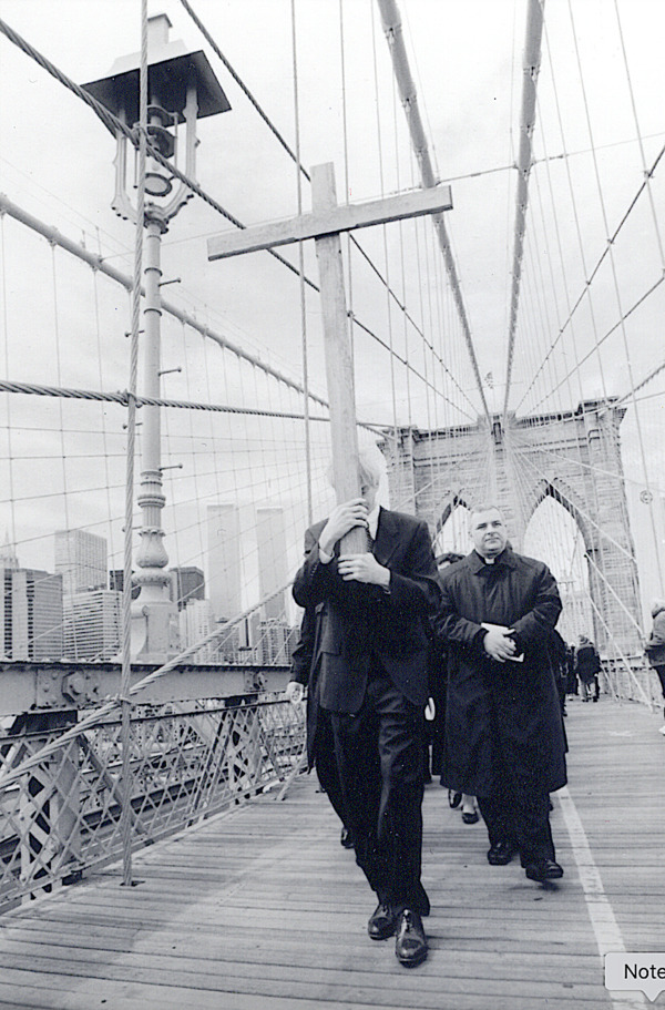 “We thought, ‘Well, why don’t we do it really publicly, and try it over the Brooklyn Bridge, and put the cross in front of the arches?’ ” Fields said. “Father Giussani would be really happy, we thought.”