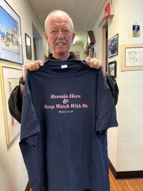In recent years, St. Francis Prep students sponsored an annual sale of t-shirts printed with scriptural messages that commemorate the Lenten project. This year, the $20 shirts stated, “Remain Here and Watch with Me” — Jesus’ plea to his apostles prior to the Agony in the Garden (Matthew 26:38).