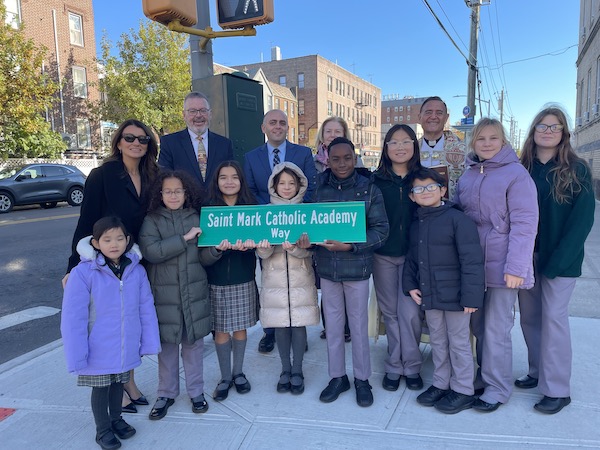 The sign isn’t there just for decorative purposes, it came as the result of an official city action. The City Council passed a bill in July sponsored by Councilwoman Inna Vernikov (R-Sheepshead Bay) to rename the street corner, signifying the city’s official recognition of Saint Mark Catholic Academy.