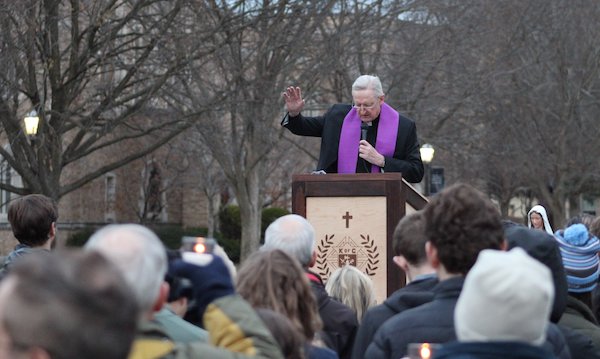 Holy Cross Father Wilson Miscamble, a retired history professor at Notre Dame and a very outspoken critic of the recent Ostermann appointment, then led a blessing of vigil candles being distributed throughout the crowd. But his prayer was also a prayer of intercession for the university with a very clear message.