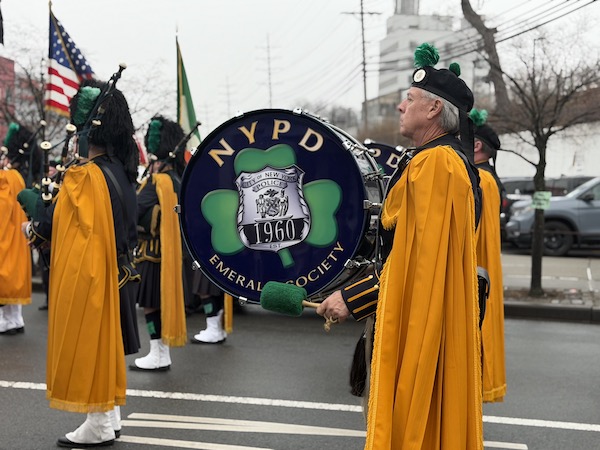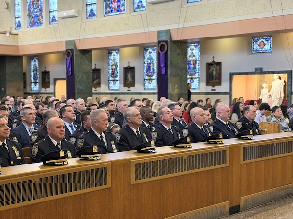 Before the breakfast, Bishop Robert Brennan celebrated Mass at Our Lady of Lourdes Church in Queens Village, which nearly 400 people attended. Officers wore their uniforms to Mass and then marched to nearby Antun’s banquet hall, led by the NYPD Emerald Society Pipes and Drums.