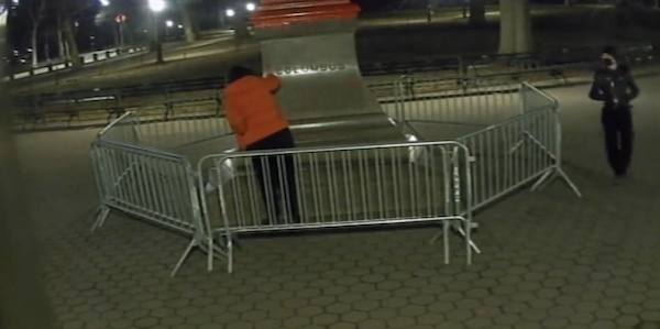 MANHATTAN — The NYPD released surveillance video on Tuesday of two vandals who spray-painted “Murderer” and “Give Us Our Land Back” on the Christopher Columbus statue located inside Central Park.