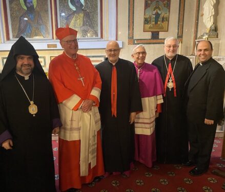 Bishop Mesrop Parsamyan, primate of the Eastern Diocese of the Armenian Church of North America; Cardinal Timothy Dolan, archbishop emeritus of New York; Bishop Gregory Mansour of the Eparchy of Saint Maron of Brooklyn; Auxiliary Bishop Emeritus Octavio Cisneros of Brooklyn, Bishop Mikael Mouradian of the Armenian Catholic Eparchy of Our Lady of Nareg in the United States and Canada; and Father Dominique Hanna, rector of the Eparchy of Saint Maron of Brooklyn Our Lady of Lebanon Cathedral; at the Ecumenical Prayer Service on the anniversary of the Council of Nicaea at our Lady of Lebanon Maronite Cathedral. (Photo: John Alexander)