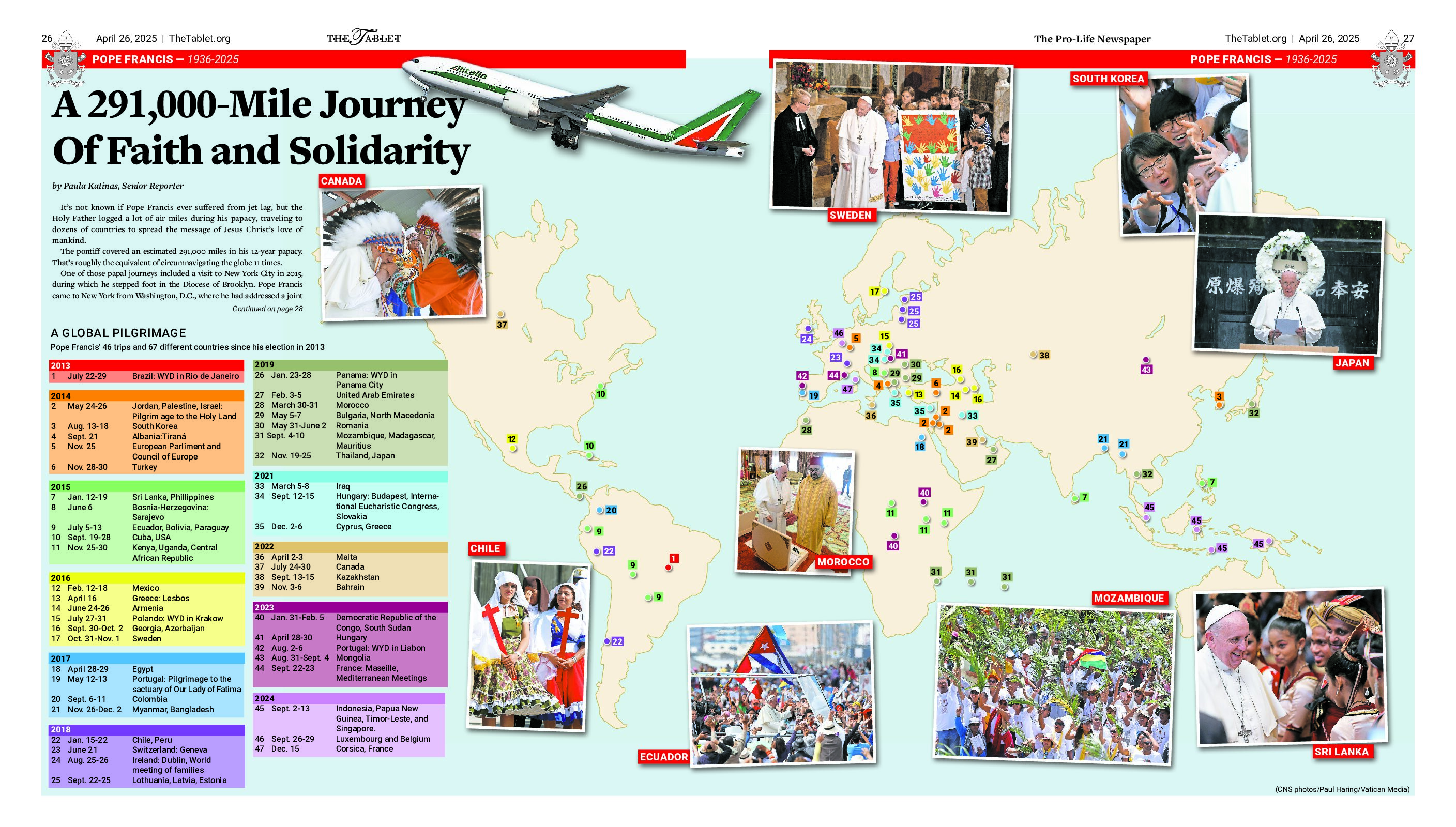 Click the image below to view the full map of Pope Francis’ travel over the course of his pontificate from the April 26, 2025 print edition of The Tablet.