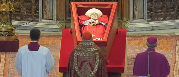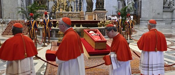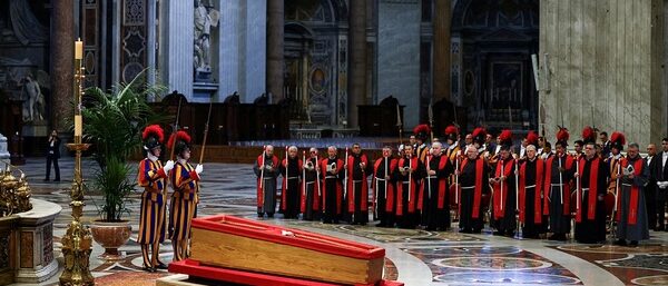 Pope Francis’ body, in a zinc-lined wooden casket covered in red fabric, was placed before the main altar on a low platform cut at an angle so that people coming to pay their respects could see his face.