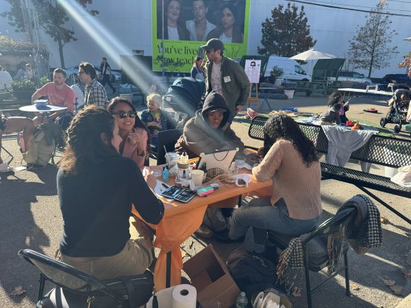 Women enjoy a moment of care and connection as they get their nails done at one of the activity tables during the Shalom Catholic Community’s Friendsgiving event outside of San Damiano Mission Roman Church in Greenpoint. (Photo: Alexandra Moyen)