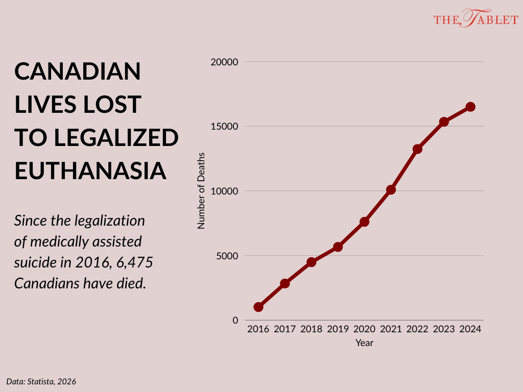 Data published by the Canadian government shows that in 2024, there were 16,499 MAiD deaths, which were about 5% of all deaths in the country. The data also shows that as of 2024, 76,475 Canadians have died by MAiD since its legalization in 2016.