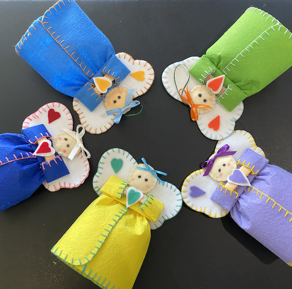 Last month, Sisters Eileen Payne, Louise Cullen, and Eileen Corrigan sat together, making the dolls – complete with felt wings, colorful bows for halos, and small fabric hearts stitched to their chests.