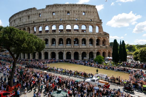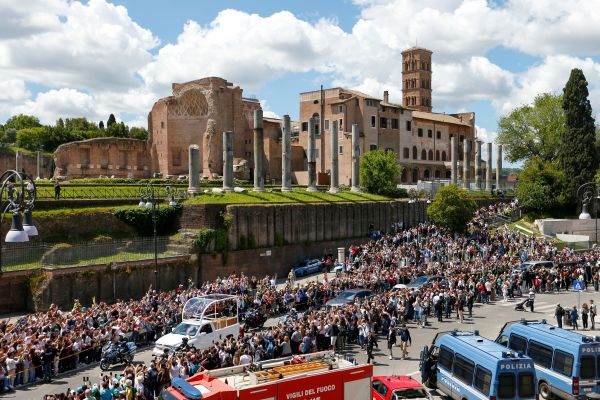 Along the wide boulevard in front of Torre Argentina, where Julius Caesar was assassinated in 44 A.D., tourists and bystanders packed the streets, some teetering on top of the stone walls around the ancient site. Residents were leaning out of their upper-story apartment windows, everyone camera-ready. When the motorcade passed, people clapped and cheered, some shouting “Grazie, Papa Francesco” (“Thank you, Pope Francis) and “Viva il papa.” (“Long live the pope”).