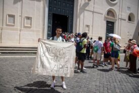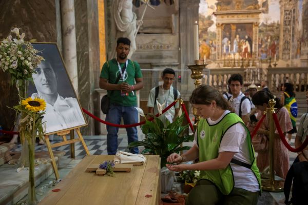 ROME (CNS) – Volunteers watching over the relics of Blessed Pier Giorgio Frassati gently placed items from the faithful on top of his casket to make a third-class relic for the visitors to the Basilica of Santa Maria sopra Minerva, near Rome’s Pantheon, one afternoon during the Jubilee of Youth.
