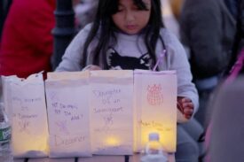 Eight-year-old Zuanny arranges luminaries with messages about her mother, a DACA “Dreamer,” herself and her sisters during a vigil at La Colaborativa in Chelsea, Mass., Oct. 10, 2025, for the community affected by raids and detentions by Immigration and Customs Enforcement. (Photo: OSV News/Brian Snyder, Reuters)
